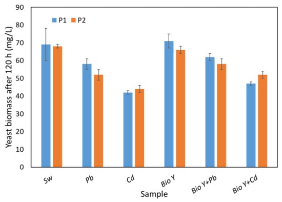 The capacity for COD removal appears to be affected by the quantity of yeast biomass obtained at the end of the 120 h experiment (Figure 5). This is contingent upon the experimental conditions, including the presence or absence of heavy metal ions and the biosurfactant in the water sample. By analyzing Figure 5, it is evident that changing the biomass amount leads to a similar behavior as in the COD analysis. Consequently, the maximum biomass (66–76 mg/L) was observed in the case of synthetic wastewater with biosurfactants. It is noteworthy to mention that slightly elevated values of the biomass amount were obtained in the case of R. mucilaginosa CMGB-G1 (P1).