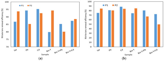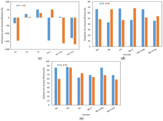 A particular case was observed in the reduction of ammonium ions (Figure 6c), where the majority of tested samples exhibited an increase in their ion concentrations throughout the experiment. Reductions of up to 51% were observed in synthetic wastewater with Cd2+ (R. mucilaginosa CMGB-G1 (P1) and synthetic wastewater Bio Y (R. mucilaginosa CMGB188 (P2). Smaller reductions were noted for R. mucilaginosa CMGB-G1 (P1) in the presence of Pb2+ (29%) and in the presence of Pb2+ and Bio Y (5%). R. mucilaginosa CMGB188 (P2) exhibited similar reductions, but in water contaminated with Cd2+ and Pb2+. All the other samples showed increases in ammonium ion concentrations ranging from +35% (R. mucilaginosa CMGB-G1 (P1) in Sw) up to + 145 and + 168% for the rest of the samples. A possible explanation for the accumulation of ammonium ions could be that during the development of yeast strains, nitrogen is metabolized and transformed into ammonium ions, which correlates with an increase in conductivity (see Table 2) [60].