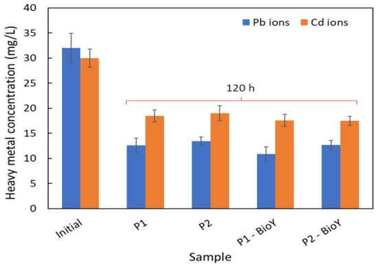 A comparison of the efficiency of Pb and Cd ions for all tested samples, after 120 h (Figure 7), suggested that the sample type influenced the removal efficiency. Thus, both R. mucilaginosa strains presented higher Pb2+ removal efficiencies compared to the samples without biosurfactants: R. mucilaginosa CMGB-G1 (P1)—66% in Bio Y vs. 61%, respectively; R. mucilaginosa CMGB188 (P2) 59% vs. 58%, respectively. In the case of synthetic wastewater with Cd2+, the removal efficiency was lower compared to Pb2+, ranging between 41 and 42% for all the samples.