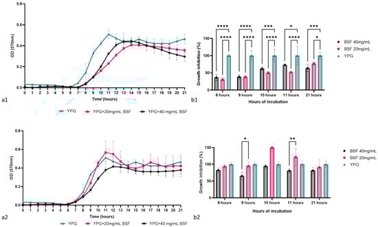For the antimicrobial properties of the biosurfactant triplicates, data were expressed as mean ± SD, and statistical analysis was performed using GraphPad Prism v9. Data were analyzed using ordinary two-way ANOVA using post hoc tests (Tukey’s correction for the growth inhibition percentage and Dunnett’s test for the PICA%) for multiple comparisons, with individual variances calculated for a comparison between the biological activities of the biosurfactant and the control strain. The significance level was set at p < 0.05.