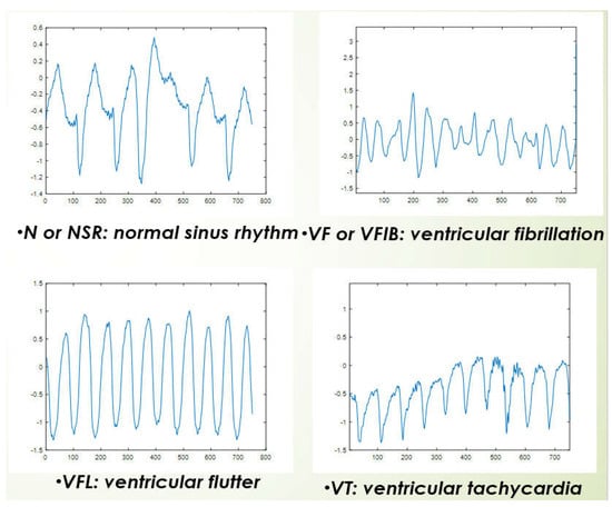 The MIT-BIH Malignant Ventricular Ectopy Database (VFDB) can be found on the Physionet.org portal [31,32,39]. It consists of 22 half-hour ECG recordings of subjects who experienced sustained ventricular tachycardia, ventricular flutter, and ventricular fibrillation. The database yields a reference comment containing just rhythm marks, with no beat marks or indexed beats. The annotations for pace changes are situated at the beginning of the event of the respective rhythm, and there are 15 distinct tags used in the database, including atrial fibrillation (AFIB), asystole (ASYS), ventricular bigeminy (B), first-degree heart block (BI), high-grade ventricular ectopic activity (HGEA), normal sinus rhythm (N or NSR), nodal (“AV junctional”) rhythm (NOD), noise (NOISE), pacemaker (paced rhythm) (PM), sinus bradycardia (SBR), supraventricular tachyarrhythmia (SVTA), ventricular escape rhythm (VER), ventricular fibrillation (VF or VFIB), ventricular flutter (VFL), and ventricular tachycardia (VT). The ECG signals were acquired using a sampling frequency of 250 Hz.