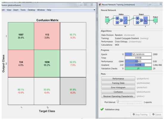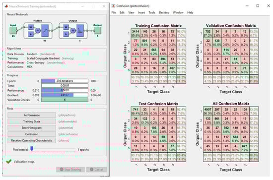 In Figure 5, the classification results for MLP with 40 neurons on the hidden layer are presented. The confusion matrix of the test set shows a classification rate of 85.4%, with a close distribution of the five classes in terms of classification rates. Distribution of the data between the three sets, the training set, the validation set, and the test set, was 70–15–15%, respectively.