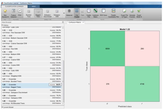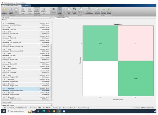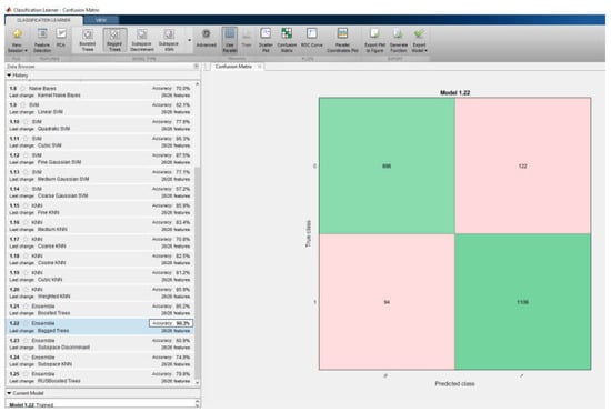 Figure 8 presents the classification results from 40 min in advance of the time of FV installation with all classifiers accessible in MATLAB®. All classifiers demonstrated good results of over 88%, with the best results exceeding 99% coming from an ensemble of classifiers.