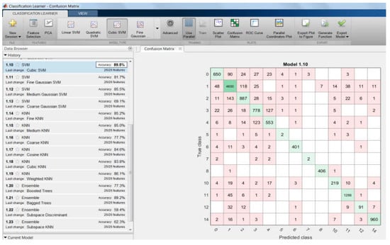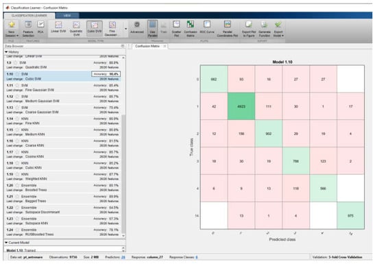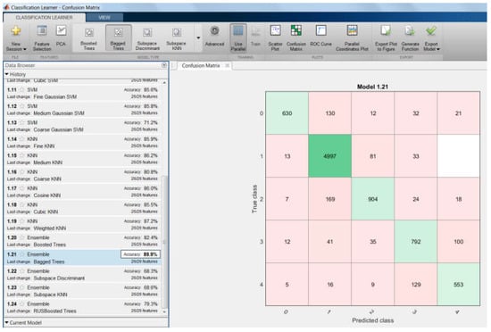 Figure 4 presents the classification results for various classifiers in MATLAB® with the Machine Learning toolbox. There is a decrease in the classification rate by a few percentages compared to the classification in two classes. The best results were obtained with an ensemble of classifiers, namely, a classification rate of 89.9%. On the confusion matrix, it can be seen that the five classes are not evenly distributed, but a uniform classification rate is observed for the five classes.