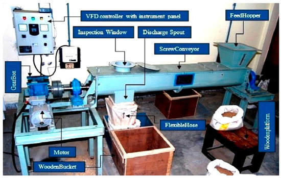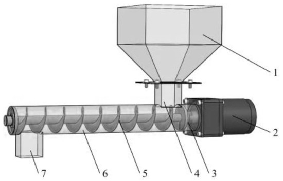 Mondal et al. [9] designed a conveying screw machine for the short-distance transportation of small-particle materials. Its structure is depicted in Figure 2. A bench test study on the filling rate at different screw speeds was conducted, and it was found that when the speed is between 15 and 21 rpm, the filling factor remains within the range of 0.76~0.81, which means the machine has high accuracy when applied to fertilizer transportation.