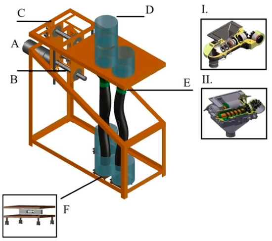 Diagonal projection of the electronic and automated bench. Note: A. electrical control; B. transmission set; C. articulation; D. reservatory; E. spiral fertilizer dischargers; F. data acquisition system. I. single spiral fertilizer dischargers; II. double spiral fertilizer dischargers.