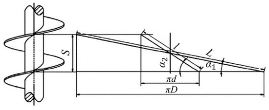 Approximate expansion view of spiral blades. Note: α is the helix angle, S is the thread pitch, D is the diameter of the spiral blade at a certain point.