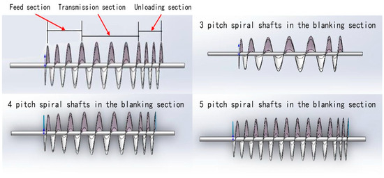 Wang Jie [15] employed discrete element simulation to investigate the organic fertilizer discharger, with the aim of revealing the movement process of fertilizer particles within it. Additionally, the study aimed to analyze the correlation between the amount of discharged fertilizer and both the rotation speed of the discharge shaft and the number of pitches in the variable diameter and variable pitch section of the shaft’s feeding section. The structure of the fertilizer discharge shaft is illustrated in Figure 6. Through two-factor and three-level simulation tests along with field trials, it was concluded that the rotation speed of the fertilizer discharge shaft has a more significant impact on the discharged fertilizer amount compared to the number of pitches in the variable diameter and variable pitch section of the shaft. Notably, when the number of pitches in the feeding section of the fertilizer discharge shaft is set at three, the stability variation coefficient of fertilizer discharge can be reduced to the minimum level, ranging from 6.93% to 7.50%, aligning with relevant industry standards.