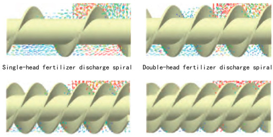 Xiao Wenli et al. [16,17] devised a four-head, spiral, double-row fertilizer discharger tailored for rapeseed cultivation. The structure of the fertilizer discharge spiral blade is depicted in Figure 7. They executed single-factor discrete element analysis experiments aimed at simulating the movement of compound fertilizer particles within the fertilizer discharger. Through comparative experiments and iterative optimization, it was ascertained that the four-head fertilizer discharge spiral configuration should be adopted, with optimal performance achieved at a pitch of 24 mm. Combining bench and field trials, it was deduced that maintaining a fertilizer discharge spiral blade speed within the range of 40 to 60 rpm ensures that the variation coefficient of the fertilizer discharge uniformity for the three fertilizers remains below 6.8%. Additionally, the stability of the total fertilizer discharge and the consistency coefficient of variation for the double-row fertilizer discharge do not exceed 2.6%. Field trial results indicate a relative error of 2.33% between the actual and target fertilizer application amounts, meeting the requisites for basal fertilizer application quantity and fertilizer uniformity.