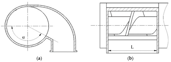 Two different types of radial fans: (a) A1 radial fan; (b) B1 radial fan. Note: A is the entrance; B is the exit. 1. fan; 2. volute; 3. air distribution box.