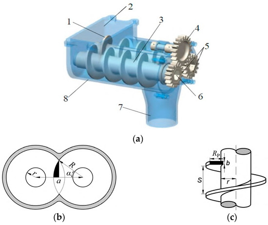 Schematic diagram of the overall and partial structure of the spiral double-wheel fertilizer discharger: (a) the overall structure of the spiral double-wheel fertilizer discharger; (b) shell cross-section; (c) fertilizer wheel chart. Note: a is the center distance, r is the inner diameter of the spiral blade, Rp is the height of the blade, b is the thickness of the spiral blade, S is the pitch. 1. spiral blade; 2. fertilizer inlet; 3. fertilizer discharge wheel; 4. large gear; 5. pinion; 6. inner hexagonal hole; 7. fertilizer discharge port; 8. housing.