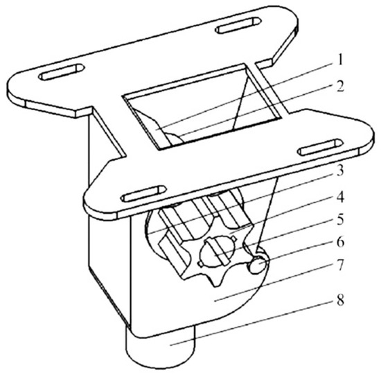 The working principle of groove wheel fertilizer dischargers is as follows: the groove wheel rotates around the axis, and through the movement of the groove wheel teeth, the granular fertilizer dropped from the fertilizer box is conveyed to the fertilizer discharge port and ultimately discharged onto the soil. Its structure is depicted in Figure 11 [22]. This fertilizer discharger imposes stringent requirements on the physical properties of fertilizers. When handling wet granular fertilizers and powdery fertilizers, fertilizer discharge pulsations are prone to occur [23]. Fertilizers with poor fluidity can easily block the groove wheel, impeding proper operation. With its simple structure and suitability for various types of fertilizers, the groove wheel fertilizer discharger has rapid fertilizer discharge and is widely employed. Nonetheless, it exhibits significant variations in fertilizer discharge effects and may encounter challenges related to poor control accuracy and linearity.
