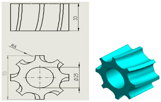Bangura et al. [24] devised a spiral groove wheel fertilizer discharge device to replace the traditional straight groove wheel fertilizer discharge device. The structure of the groove wheel is depicted in Figure 12. The discrete element method was employed to test and simulate the fertilizer discharge performance. Results indicate that, under similar conditions, the spiral groove wheel demonstrates superior fertilizer discharge stability and uniformity compared to the straight groove wheel, with fertilizer particles falling at a faster rate. The relative error between the actual test results and the simulation results is less than 10%. The performance of the developed spiral groove wheel surpasses that of the traditional straight grooved wheel, thereby providing a theoretical foundation for the design of high-performance fertilizer dischargers.
