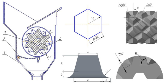 Pin-roller fertilizer discharger. Note: 1. discharge box; 2. flap; 3. shaft; 4. pin-roller. n is the number of right and left entry lines, β is the angle between the vertical axis and the right and left entry lines, h is the height of the roller pin, α is the angle between the hexagonal polygon and the pin inclination.