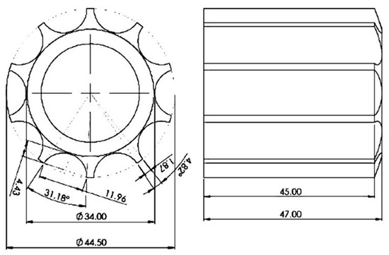 Lillerand et al. [26] utilized a straight groove wheel fertilizer discharger to achieve precise fertilizer discharge in blueberry planting. The dimensions and cross-sectional area of the grooved wheel are illustrated in Figure 14. The efficacy of precise fertilization using three nitrogen, phosphorus, and potassium solid granular fertilizers was verified. After measuring the fertilizer discharge quality under various conditions, statistical analysis revealed that the coefficient of variation of fertilizer discharge uniformity from the device exceeded 10%, indicating the need for further research and improvement. While this fertilizer discharger demonstrates relative suitability and accuracy when applying one of the three fertilizers, it falls short of meeting the target fertilization rate when applied to the other two fertilizers. Thus, there is a need to enhance its versatility.