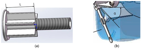 Structural diagram of the fertilizer discharge port: (a) schematic diagram of the angle of the fertilizer outlet; (b) schematic diagram of the length of the fertilizer outlet. Note: α represents the angle of the fertilizer discharge port; L represents the length of the fertilizer discharge port.
