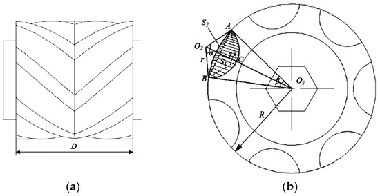 Structural diagram of opposed double-spiral sheave wheels: (a) top view; (b) left view. Note: D is the diameter of the sheave and the maximum effective working length; r is the radius of the concave section.