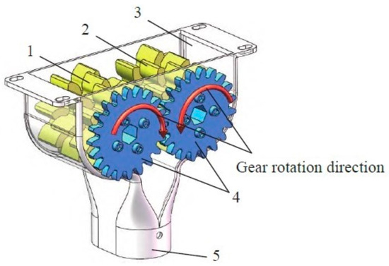 Structural diagram of staggered gear fertilizer discharger. Note: 1. left-hand rotation groove wheel; 2. right-hand rotation groove wheel; 3. shell; 4. transmission gear; 5. fertilizer discharge port.