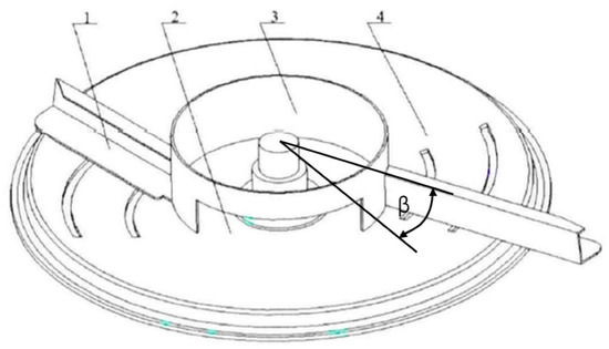 Structural diagram of centrifugal disc fertilizer discharger. Note: 1. blade; 2. evening outlet; 3. evening cover; 4. disc; β is the blade position angle.