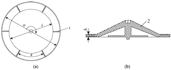 The working principle of disc fertilizer dischargers is as follows: fertilizer particles drop from the fertilizer box onto the fertilizer spreading disc. The fertilizer blades rotate around the axis, striking the fertilizer as they rotate at a certain speed, pushing the fertilizer toward the edge of the disc. The amount of fertilizer discharged can be adjusted by changing the rotation speed of the turntable and adjusting the height of the door. Finally, under the action of centrifugal force, the fertilizer is thrown out at a consistent speed. The structure of disc fertilizer dischargers includes a fertilizer-spreading disc, along with two or more fertilizer-spreading blades, as depicted in Figure 22. This fertilizer discharger is primarily suitable for granular and powdered fertilizers, offering good looseness and fluidity. It features a simple structure, high operational efficiency, uniform fertilization, and minimal risk of fertilizer accumulation. Although widely utilized, it encounters challenges related to high resistance due to its structure [35].