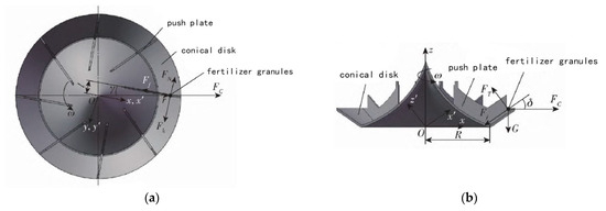 - Liu, X.D.; Ding, Y.C.; Shu, C.X.; Wang, K.Y.; Liu, W.P.; Wang, X.P. Analysis and test of disturbance and anti-blocking mechanism of spiral cone centrifugal fertilizer discharger. J. Agric. Mach. 2020, 51, 44–54. [Google Scholar]