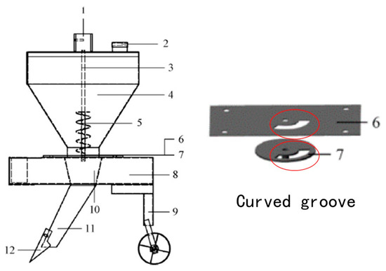 Based on theoretical analysis, Zhou Bin [29] examined the fertilizer discharge process of the groove wheel fertilizer discharger through discrete element simulation. Its structure is depicted in Figure 16. Single-factor and orthogonal experiments were devised to process the acquired data. The optimal parameter combination was a rotation speed of the groove wheel of 34.52 rpm, an effective working length of the groove wheel of 56.01 mm, and a depth of the sheave of 36.287 mm. Subsequently, in conjunction with bench testing, it was determined that the variation coefficient of the potassium fertilizer discharge amount was 8.68%, and the variation coefficient of the compound fertilizer discharge amount was 10.64%. The error between the simulated and actual fertilizer discharge amounts was less than 7%. The optimized fertilizer discharger exhibited superior performance in the jujube orchard.