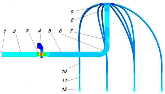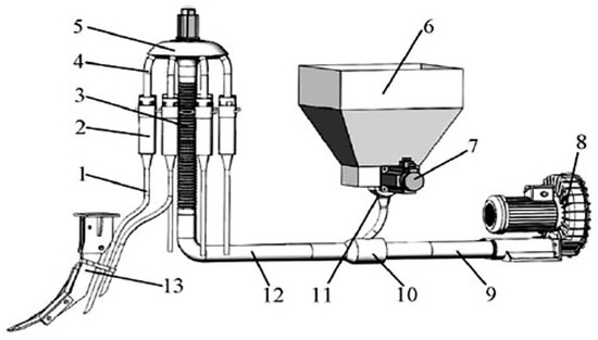 Installation diagram of pneumatic conveying system of pneumatic seeder. Note: 1. fan installation position; 2. air duct; 3. nozzle; 4. seed metering device; 5. horizontal pipe section; 6. bend pipe; 7. vertical pipe section; 8. guide; 9. distributor; 10. delivery pipe (hose); 11. coulter; 12. coulter nozzle.