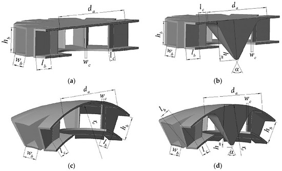 Schematic diagram of the longitudinal section of the main body of different distribution devices: (a) flat-top type; (b) flat-top inverted cone type; (c) dome type; (d) dome inverted cone type.