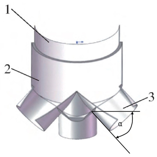Schematic diagram of the partial structure of the fertilizer distributor. Note: α is the inclination angle of the fertilizer discharge port. 1. distributor inlet; 2. distributor housing; 3. fertilizer discharge port.