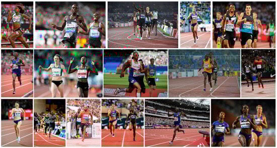 In this dataset, two methods, RandomErasing [22] and GridMask [23], were employed for data augmentation on the training set, resulting in 2197 augmented training images encompassing instances of 2590 runners. The data-augmentation effect is illustrated in Figure 5. The processed images commonly include limb occlusions or extensive occlusions, which facilitate training the network under occlusion conditions, thereby enhancing the network’s prediction capability under such conditions.