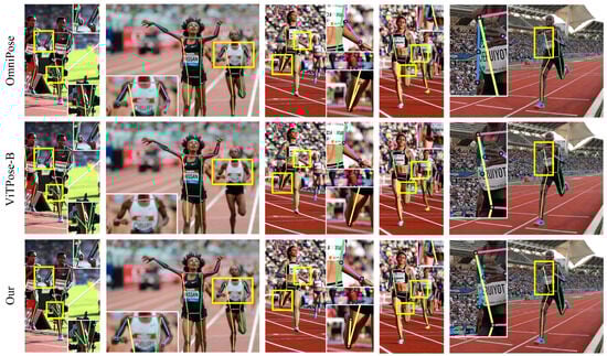 We selected several state-of-the-art approaches and conducted experiments under the same conditions with an input image size of 256 × 192 (256 × 256 for the PCT [7] method). All experiments utilized weights pre-trained on the COCO [5] training dataset and underwent 210 rounds of fine-tuning training on the Running Human dataset. The experimental results are presented in Table 1. The experimental results indicate that our proposed method significantly outperforms other state-of-the-art approaches, including OmniPose [26], the leading method on the LSP [27] dataset; PCT, the leading method on the MPII [8] dataset; and ViTPose [6], the leading method on the COCO dataset.