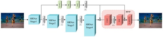 HRNet [4] is a highly representative high-resolution multi-scale feature fusion network, as shown in Figure 1. The network consists of four stages, each of which incorporates output features from different scales. The output of the final stage is directly fused through an information interaction unit, resulting in the generation of the final heatmap of keypoint locations on the human body. The output features from different stages represent semantic information at different levels. Shallow-level features contain information on crucial details, as is essential for the task of human pose estimation. However, the method for directly aggregating features of the final stage does not incorporate the fusion of shallow-level features. Instead, in order to fully leverage the detailed information contained in shallow-level features, this study proposes an RFSP module and integrates it with HRNet. This approach leads to an improved high-resolution multi-scale feature fusion network called Running Human Posture Network (RHPNet) that effectively enhances the localization accuracy of occluded joints and edge joints in the model.