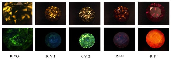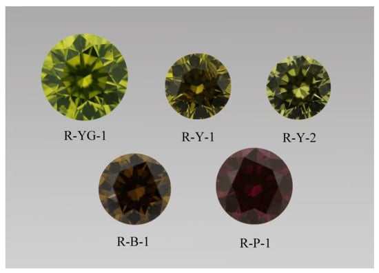 The samples tested in this study were five natural diamonds from Russia, and they were subjected to high-temperature and high-pressure treatment to change their color (Figure 1). The colors of the samples mainly include yellow-green (R-YG-1), yellow (R-Y-1, R-Y-2), purple-red (R-P-1), and brown (R-B-1). The HTHP treatment of diamonds was carried out in a cubic press. The temperature range was 1600~2400 °C, the pressure range was 5.5~8 GPa, and the time range was 15~30 min. In this paper, the basic gemological properties of the samples were observed by a gemological microscope, crossed polarizers, and ultraviolet fluorescent lamps. Micro-IR was used to identify the type of diamond. Bruker Lumos FTIR was used for spectral analysis, with a wave number range of 600~4000 cm−1, 32 scans, and a resolution was 4 cm−1. DiamondViewTM was applied to observe the growth structure and fluorescence from the samples at room temperature using a short-wavelength (<230 nm) ultraviolet light source. The above two tests were completed in the gem laboratory of the School of Gemmology, China University of Geosciences, Beijing. The model of the cathodoluminescence test instrument was RELIONⅢ, and the test was carried out at the Analtical Laboratory of BRIUG. A DXR Raman Microscope was used to analyze the PL spectrum. The wavelength of the laser was 532 nm, the exposure time was 1 s, and the number of exposures was 30. The 3D fluorescence spectra of the diamond samples were analyzed by the fluorescence spectrometer FL3-TCSPC. The excitation slit was 14.00 nm, the emission slit was 14.00 nm, the integration time was 0.1 s, the excitation wavelength range was 230~400 nm, and the emission wavelength range was 236~1050 nm. PL and 3D contour fluorescence plot (HORIBA Fluorolog-3) tests were completed at the Beijing branch of HORIBA (Beijing, China).