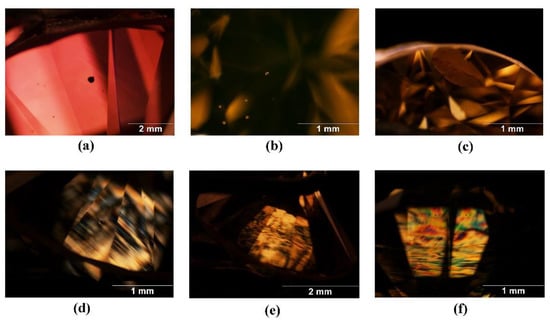 Except for sample R-P-1, the color distribution of other samples was more uniform. The local color of sample R-P-1 showed a stripe distribution. The internal characteristics of the samples were observed by a gemological microscope, and black opaque hexagonal sheet inclusions (Figure 2a), rounded colorless crystal inclusions (Figure 2b), and disc-shaped stress fractures (Figure 2c) were observed in some samples. Under orthogonally polarized light, the samples showed obvious anomalous birefringence of parallel bands (Figure 2d) or ripples (Figure 2e). The extinction geometric pattern remained basically unchanged at any rotation angle, accompanied by strong interference color (Figure 2f). The ultraviolet fluorescence characteristics of the samples are shown in Table 1.