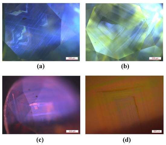 Cathodoluminescence was used to further observe the color patterns of the samples. Under high-energy cathode rays, the luminescence characteristics of the samples were basically the same as those seen in DiamondViewTM, but the luminous intensity under the cathode rays was relatively strong, and the image was sharper, thus providing more detail. Jagged growth textures were seen in the sample R-Y-1. In addition, three groups of fine flat linear textures were visible (Figure 4a). In sample R-Y-2, the edge of the part similar to the “growth nucleus” was irregular, and was cut off from the fine, straight, and quadrangular growth ring outside (Figure 4b). In addition to the blue growth ring in the sample R-B-1, a uniform orange luminescence pattern with a regular quadrilateral could be seen (Figure 4c). Sample R-P-1 presented a strip-like luminescence pattern with orange and yellow intersections, and regular laminar growth bands could also be seen inside (Figure 4d). The observation of cathodoluminescence images of diamonds can (1) reveal the internal morphology, growth structure, growth mechanism, growth stage, and process of diamonds; (2) provide the plastic deformation information of diamonds; (3) verify and interpret the results of an infrared spectrum analysis, a stable isotope analysis, and the geological chronology of the diamond microzone; and (4) provide key evidence for distinguishing a natural diamond from a synthetic diamond. It can be seen from the combination of the observation under DiamondViewTM and cathodoluminescence that, in the HTHP-treated diamond samples, the yellow-green samples presented yellow-green luminescence, while the yellow samples mainly presented luminescence characteristics of a combination of blue and green, and the brown and purple samples presented a luminescence of orange with different intensities.