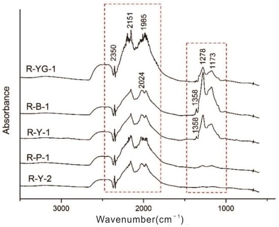 The results of the micro-IR test are shown in Figure 5. The main absorption peaks of the five samples were basically the same. They mainly included the strong absorption peaks at 2350, 2157, and 2030 cm−1 and the absorption peaks at 1282 and 1175 cm−1. For samples R-YG-1, R-Y-1, and R-B-1, the absorption peaks of 1282 and 1175 cm−1 were relatively obvious, and the peak intensity corresponding to 1282 cm−1 was greater than that of 1175 cm−1. The two absorption peaks in sample R-Y-2 and R-P-1 were weak, and some samples showed absorption peaks at 1358 cm−1.