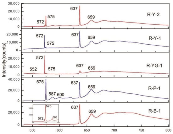 It can be seen from Figure 6 that except for the weak emission peak of the sample R-YG-1 at 552 nm, no other samples show emission peaks here. The luminescence peak at 552 nm is the intrinsic peak of the diamond, but because the fluorescence of the diamond sample is too strong, it will weaken or even disappear completely. In addition, the five samples showed luminescence peaks at 637 nm and 575 nm, but the relative intensities of the two peaks were different in different color samples: the yellow (R-Y-1, R-Y-2), yellow-green (R-YG-1), and brown samples (R-B-1) had a stronger emission peak at 637 nm than at 575 nm, while the purple-red sample (R-P-1) showed the opposite phenomenon.
