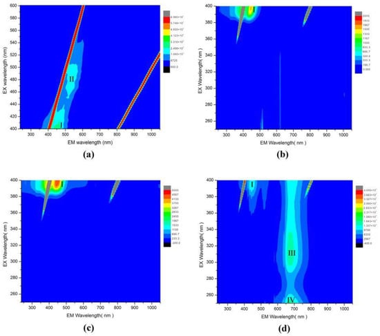 The 3D fluorescence spectra can provide fluorescence intensity information when the excitation wavelength (EX) and emission wavelength (EM) are changed simultaneously. In this paper, the contour fluorescence spectrum is used to analyze the test results of the samples. In order to more comprehensively display the 3D fluorescence characteristics of the samples, according to the excitation wavelength, it was divided into two wavelength ranges of 250–400 nm and 400–600 nm for testing and analysis.