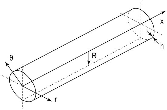 Symbols u, v and w represent the axial x, circumferential , and radial r displacements, as shown in Figure 1. The radius of the midplane is R, the lining thickness is h, the material density is , Poisson’s ratio is , and the Young modulus is E. The displacements of the shell have the following forms of wave propagation [].