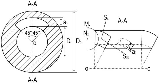 There is a section of circumferential surface crack in the wall of the shield tunnel lining. Its depth  is uniform along the circumferential direction, and the crack is always open during vibration. Figure 2 illustrates the crack morphology in a longitudinal element of unit width from the lining and the crack’s location in the annular cross-section of the tunnel lining. The outer diameter of the tube is , and the inner diameter is . Meanwhile, the cracked lining unit is subjected to axial force , bending moment , effective radial shear , and effective circumferential shear . The crack is symmetric about the lining tube axis A-A, and the crack distribution angle is  on both sides of the axis.