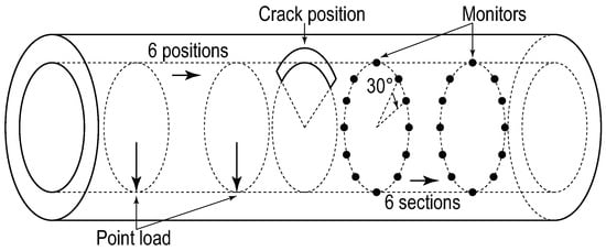 This section investigates the influence of varying load locations on the displacement response surrounding the crack. The model parameters and boundary conditions are consistent with the previous section. The locations of the crack and load points are mentioned in Section 2.5. The analysis concentrates on variations in displacement response within the crack’s impact region. Accordingly, six monitoring positions are distributed along the axial direction, with each section housing a corresponding monitoring point set at a circumferential angle of .