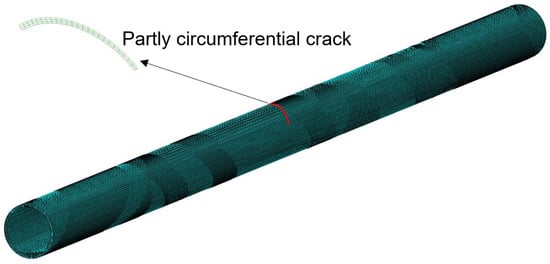 When an incident wave encounters a discontinuity at the boundary between two different media, it generates a transmitted wave and a reflected wave. The cracks do not induce a phase change in reflected, transmitted, or incident waves []. The external excitation position is set as the origin of axial coordinate x, and the distance between this external excitation point and the section containing the crack is . In each mode n, four waves are in the positive direction and four in the negative direction in the axial coordinate. Therefore, four incident waves and four reflected waves are in the crack’s left region (). The superposition of these eight waves for circumferential mode n yields axial displacement  in the area, given by the following equation. Symbol  () represents the wave amplitude.