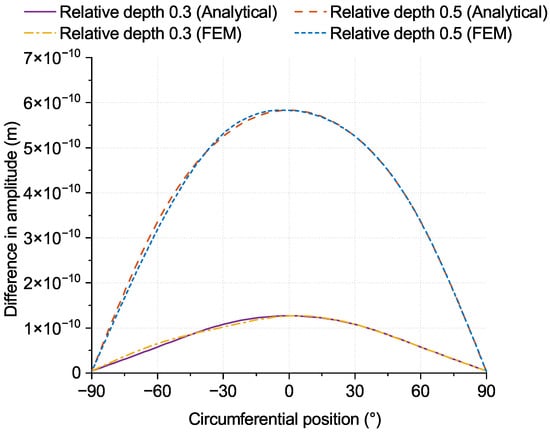 Lastly, to enhance the applicability of the proposed approach, it is essential to validate the results of the forced vibration response of the shield tunnel lining with a partly circumferential crack. The properties and dimensions of the lining remain unchanged. Figure 5 displays one example of the validation procedure. The point load’s frequency and amplitude are set at 100 Hz and 100 N. The load, crack, and monitor relative positions are 0.25, 0.5, and 0.55, respectively. Additionally, seven monitors are spaced at a circumferential angle of  between neighboring points. The figure indicates the amplitude difference in radial displacements obtained through both FEM and the proposed method across two relative depths. The vertical axis denotes the difference in displacement response amplitudes between undamaged and cracked tunnel linings. Meanwhile, the horizontal axis represents the angular distribution of monitoring points along the circumferential section. The comparison of analytical and related FEM results reveals a good agreement, irrespective of crack depth variations. This alignment attests to the correctness and accuracy of the analytical approach for the vibration response of the shield tunnel lining with a partly circumferential crack.