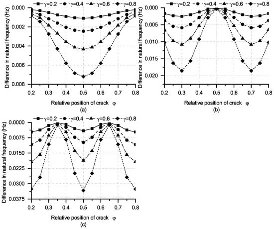 Figure 6 illustrates the relationship between the first three orders of natural frequency and crack relative depth for a partly circumferential crack. The vertical coordinate is the difference between the natural frequencies of the ideal and cracked linings. The crack’s three relative positions, ,  and , correspond to the three curves in the figure. In Figure 6a, as the crack’s relative depth increases, the tunnel lining’s first-order natural frequency shows a downward trend. The natural frequency with a relative position of  decreases the fastest among them. When the crack position moves from the middle to both ends of the lining, the trend of the first-order natural frequency changing with the relative depth slows down. Figure 6b presents the results for second-order natural frequency. In contrast to the first-order one, as the crack position approaches either end, the trend of the second-order natural frequency accelerates concerning the crack’s relative depth. Notably, the second-order natural frequency of the tunnel lining, when the crack is at a relative position of , is almost unchanged as the relative depth increases. In the third-order mode, as illustrated in Figure 6c, all such frequencies decline as the crack depth increases. The natural frequency experiences the most significant reduction when the relative crack position is at . Conversely, the natural frequency gradually decreases as the crack position approaches either end of the tunnel lining. Additionally, the third-order natural frequency curves for relative positions of  and  closely resemble each other.