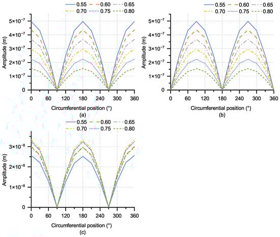 This section explores the displacement response of different monitoring points under a position-fixed harmonic point load. The model parameters and boundary conditions are the same as in Section 4.1. The relative position of the load point is . The location of the crack and monitoring points are mentioned in Section 2.5. Figure 8 depicts the displacement response of the undamaged tunnel lining subjected to harmonic point excitation. Figure 8a, b, and c represent the radial, circumferential, and axial displacement responses. The vertical axis represents the amplitude of the displacement response. The horizontal axis represents the angular distribution of monitoring points along the circumferential section. Each curve within the figure corresponds to the monitoring points’ specific axial relative position.