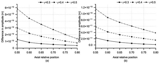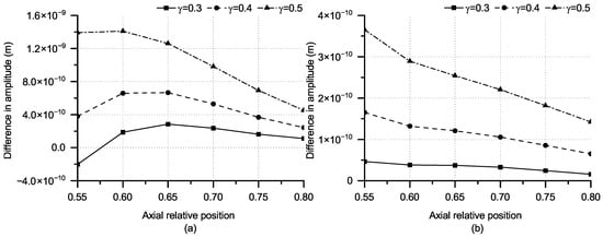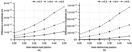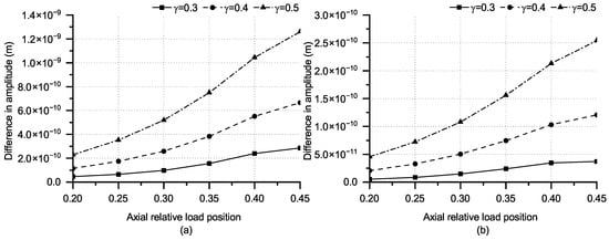Figure 12 shows the impact of the load position on another monitor’s displacement response. The monitoring point’s axial relative position is , keeping other parameters consistent with those in Figure 11. The general trend in the variation of displacement amplitude difference depicted in Figure 11 and Figure 12 is similar. Otherwise, there are some minor differences. In Figure 12, the upward trend of the radial and axial amplitude differences does not weaken when the load moves from the axial relative position of  to . In addition, the ranges of amplitude difference change for both radial and axial directions in Figure 12 and are smaller than those of corresponding directions in Figure 11.