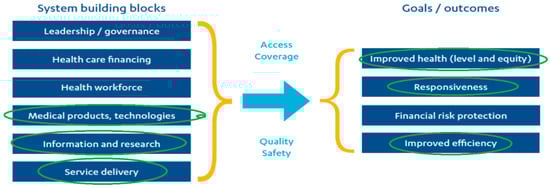 The WHO describes a health system as comprising all activities primarily aimed at improving, restoring, and preserving health []. It highlights that a well-functioning health system operates smoothly with trained, motivated health workers, has a maintained infrastructure and a reliable supply of medicines and technology, and is supported by sufficient funding, solid health plans, and evidence-based policies []. These elements are referred to as the WHO’s health system “building blocks” [,]: service delivery, health workforce, health information systems, medical products and technologies, health financing, and leadership/governance. Effective service delivery ensures safe, efficient, high-quality, patient-focused services are accessible to everyone in need, at the right time and place [,]. A strong health workforce is crucial, consisting of qualified and responsive professionals like doctors, nurses, and pharmacists, ensuring the best health outcomes [,]. A robust health information system gathers, analyzes, and shares critical health data promptly [,]. The system also guarantees access to essential, high-quality, and cost-effective medical products and technologies. Adequate health financing is vital for allowing access to health services without financial burden. Finally, effective leadership and governance involve clear policy direction, oversight, regulation, and accountability. Enhancing the health system means fostering better interactions among these building blocks to improve public health equitably and sustainably [,].