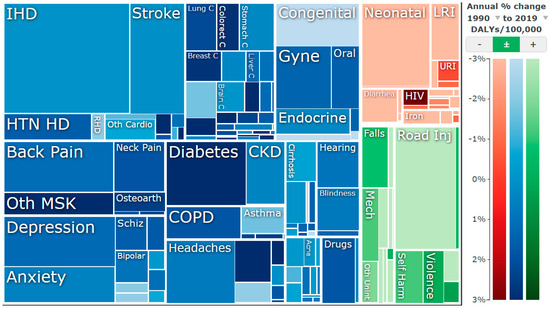 - Institute for Health Metrics and Evaluation. GBD Compare. [Online] Healthdata.org. 2019. Available online: https://vizhub.healthdata.org/gbd-compare/ (accessed on 17 February 2024).