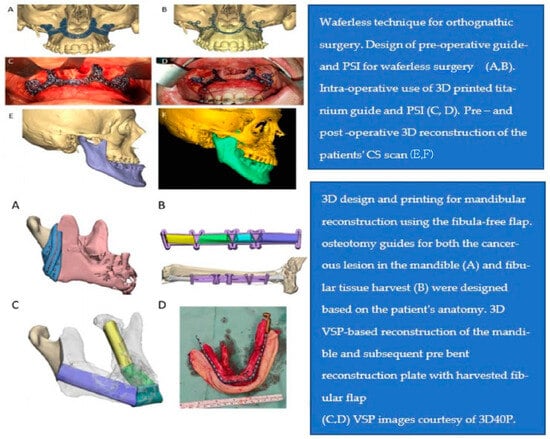 - Zoabi, A.; Redenski, I.; Oren, D.; Kasem, A.; Zigron, A.; Daoud, S.; Moskovich, L.; Kablan, F.; Srouji, S. 3D printing and virtual surgical planning in oral and maxillofacial surgery. J. Clin. Med. 2022, 11, 2385. [Google Scholar] [CrossRef]