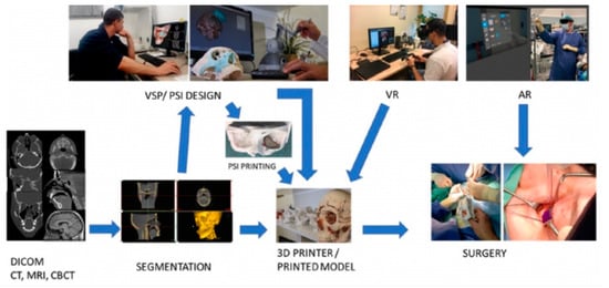 Adopted from []. Workflow at the 3DP PoC facility. Patients’ volumetric data obtained after medical imaging are translated to a digital imaging and communication in medicine (DICOM) format, followed by segmentation and 3D rendering for virtual surgical planning (VSP) and patient-specific implant (PSI) design. Both models and implants are 3D-printed, sterilized, and subsequently used for surgery. Virtual reality (VR) is used for further evaluation and simulation before surgery. Augmented reality (AR) may assist the surgical team during surgery.